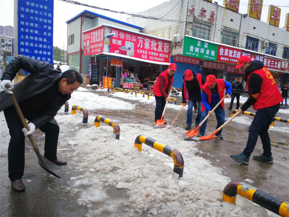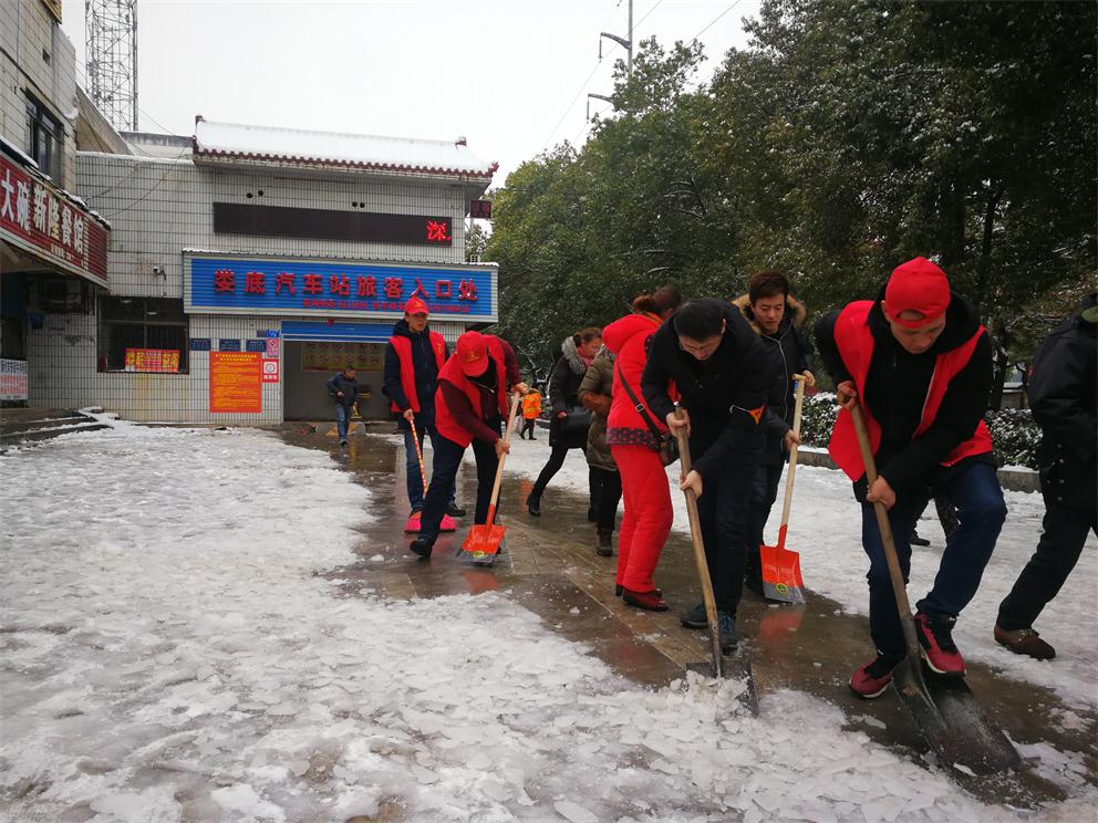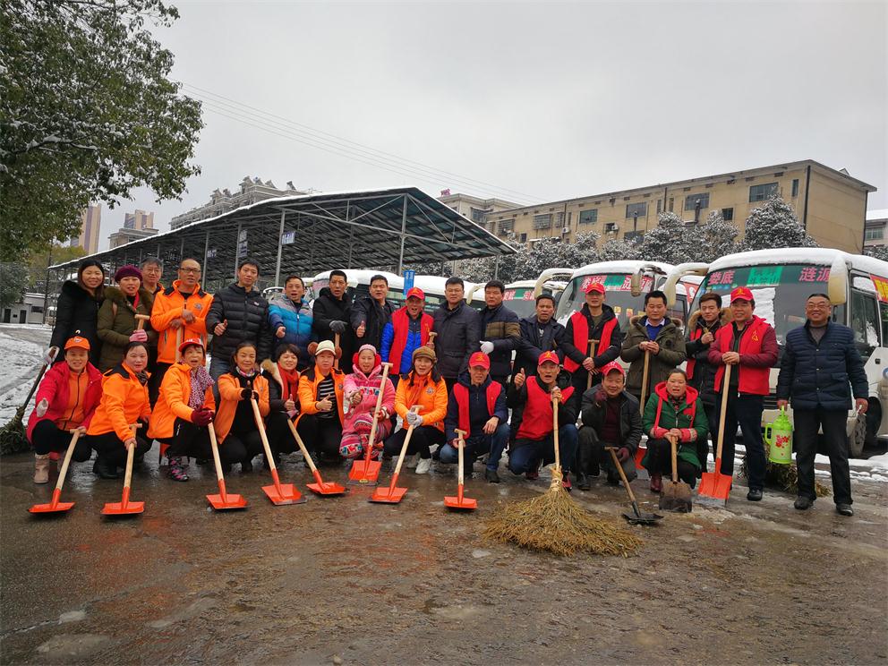 早上八點半,在車站生產(chǎn)副經(jīng)理付育平帶領(lǐng)下,辦公室、調(diào)度、稽查大隊、營收監(jiān)控隊、服務(wù)班、安保等部門近20多名志愿者拿著鏟子、鐵鍬和竹掃把等工具,對車站旅客入口處通道、車輛進站通道、車站站坪、短途通道、車輛出站通道等地的堅冰進行鏟除,寒風(fēng)凜冽,積雪厚重,冰塊堅硬,但我們的雷鋒志愿者們熱情高漲,大家發(fā)揚不怕若不怕累的精神,齊心協(xié)力,分工合作,揮鍬掄鎬,鉚足了勁,發(fā)起了挑戰(zhàn)嚴(yán)冰暴雪的攻堅戰(zhàn),在車站奏響了美妙的樂意,汗水濕透了背脊,手掌磨起了血泡,冰雪打濕了鞋襪,大家全然不顧,只看見一頂頂小紅帽在雪地上不停的運轉(zhuǎn),很多駕駛員和班線承包人紛紛加入鏟雪隊伍,婁星微馬隊的20多名隊員們在他們隊長的帶領(lǐng)下也來到車站幫著一起鏟雪除冰,他們橙色的微馬隊服也是一道道靚麗的風(fēng)景線。大家都有一個共同的名字——學(xué)雷鋒志愿者!他們的一言一行彰顯真情,贏得了過路市民的連聲稱贊!